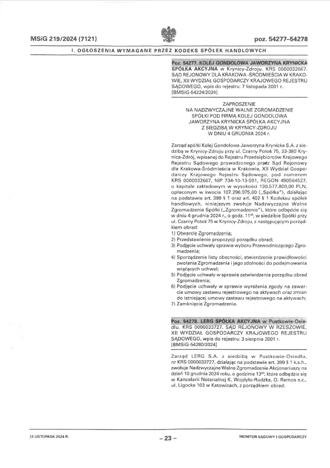 • Ogłoszenie o Nadzwyczajnym Walnym Zgoromadzeniu Akcjonariuszy Spółki w dniu 04.12.2024 r